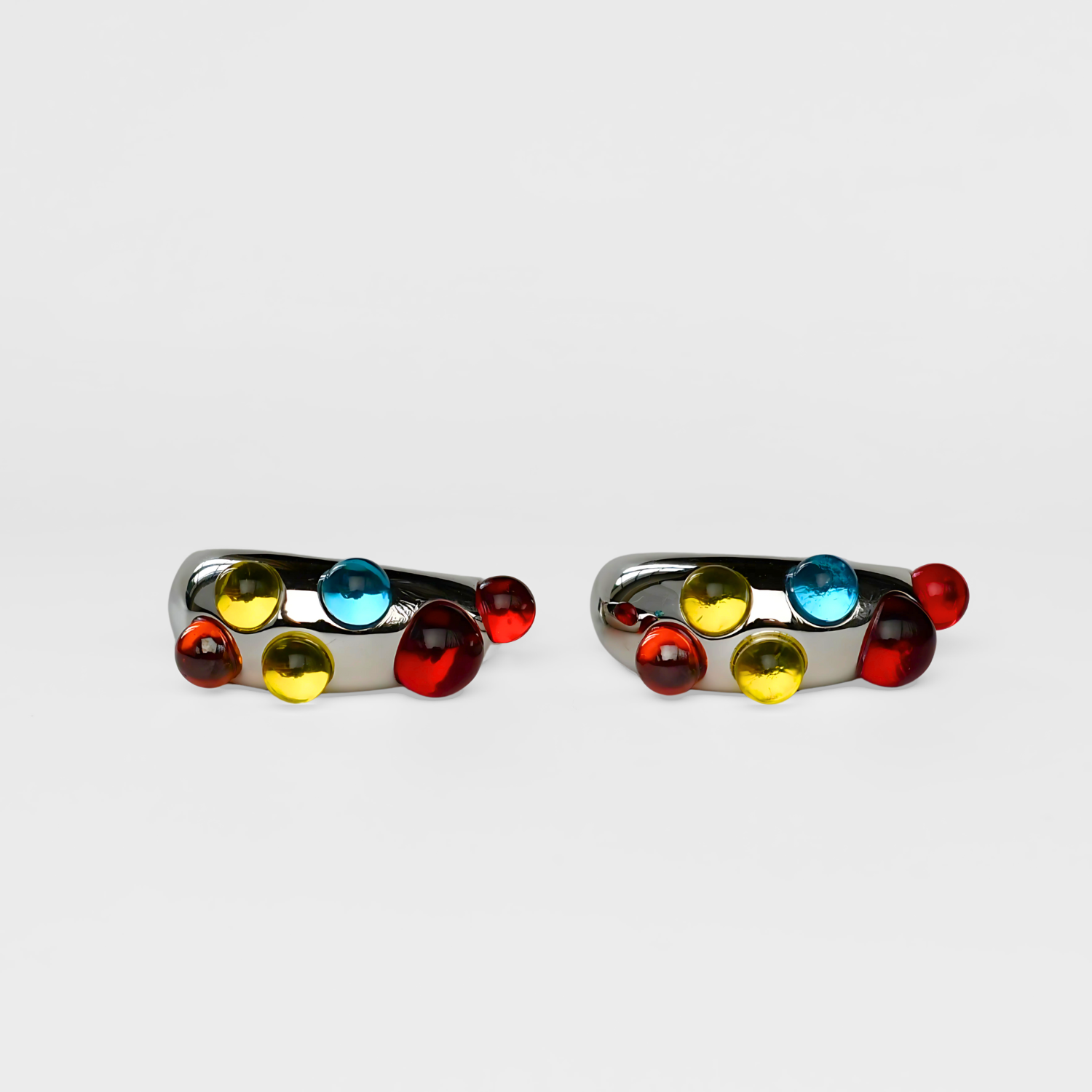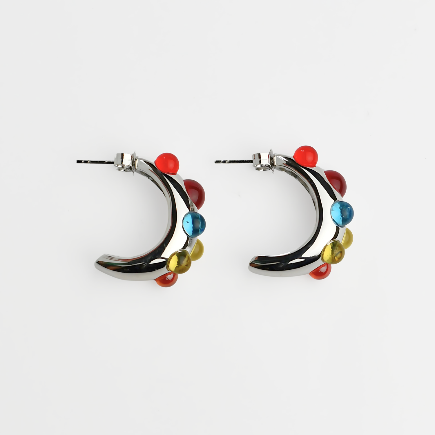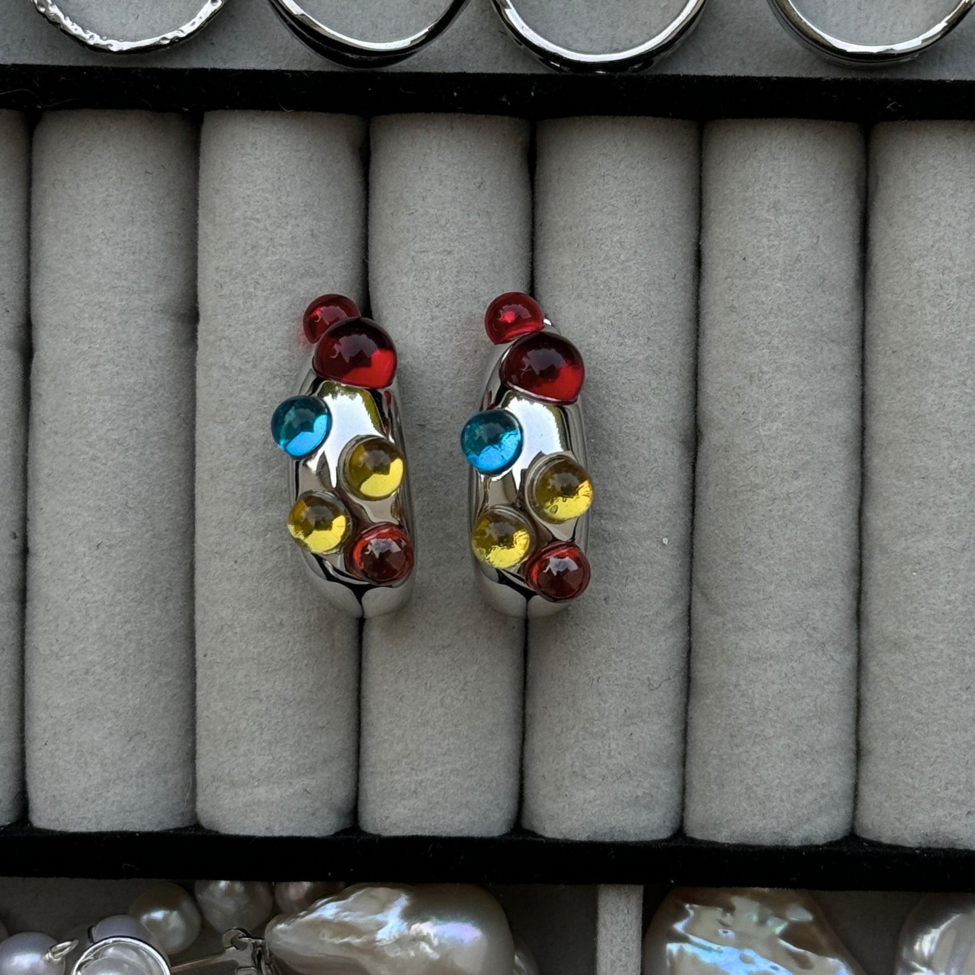 Large, chunky earrings with colorful stones that beautifully refract light. Made of 925 sterling silver, rhodium coated, 30mm size.