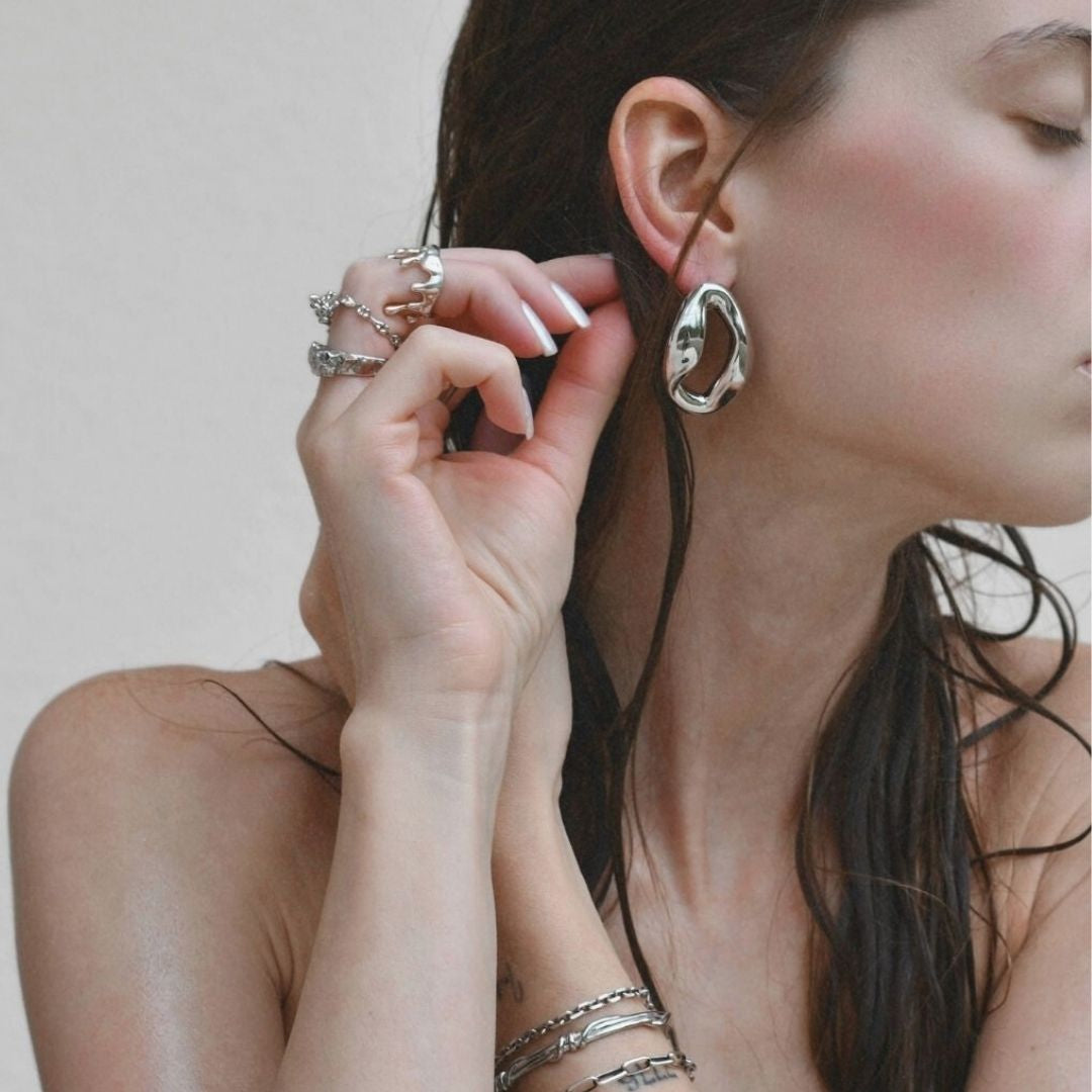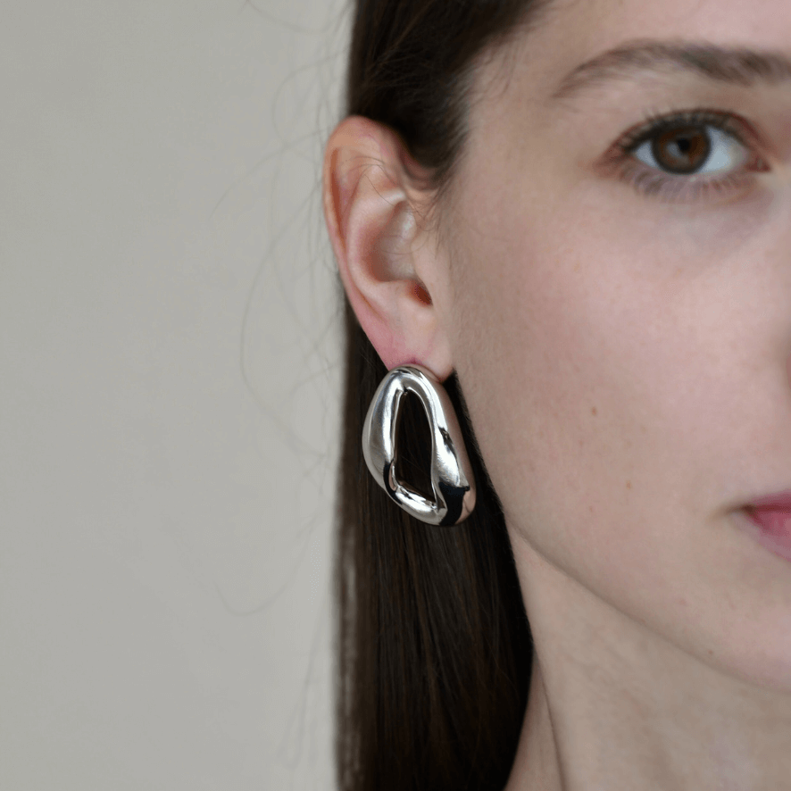 Big, chunky, oval, irregular earrings. 40mm long, 25mm wide. Made of rhodium coated 925 sterling silver.