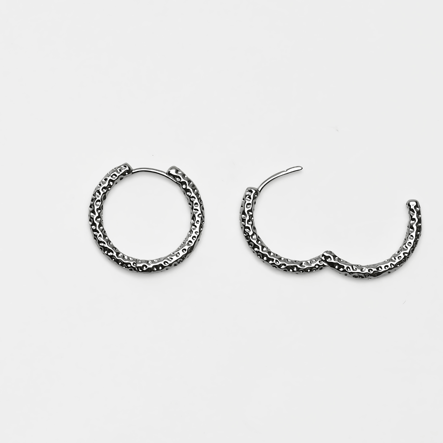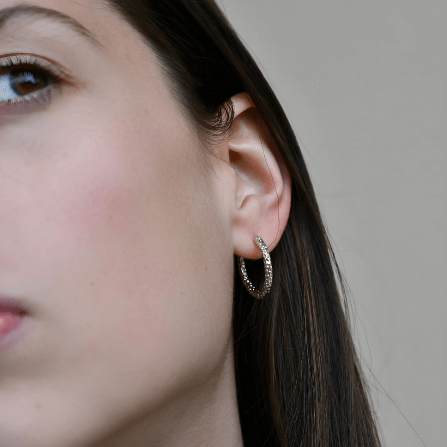 Hoops earrings with grainy structure, diameter of the earring is around 21mm. Made with rhodium coated 925 sterling silver.