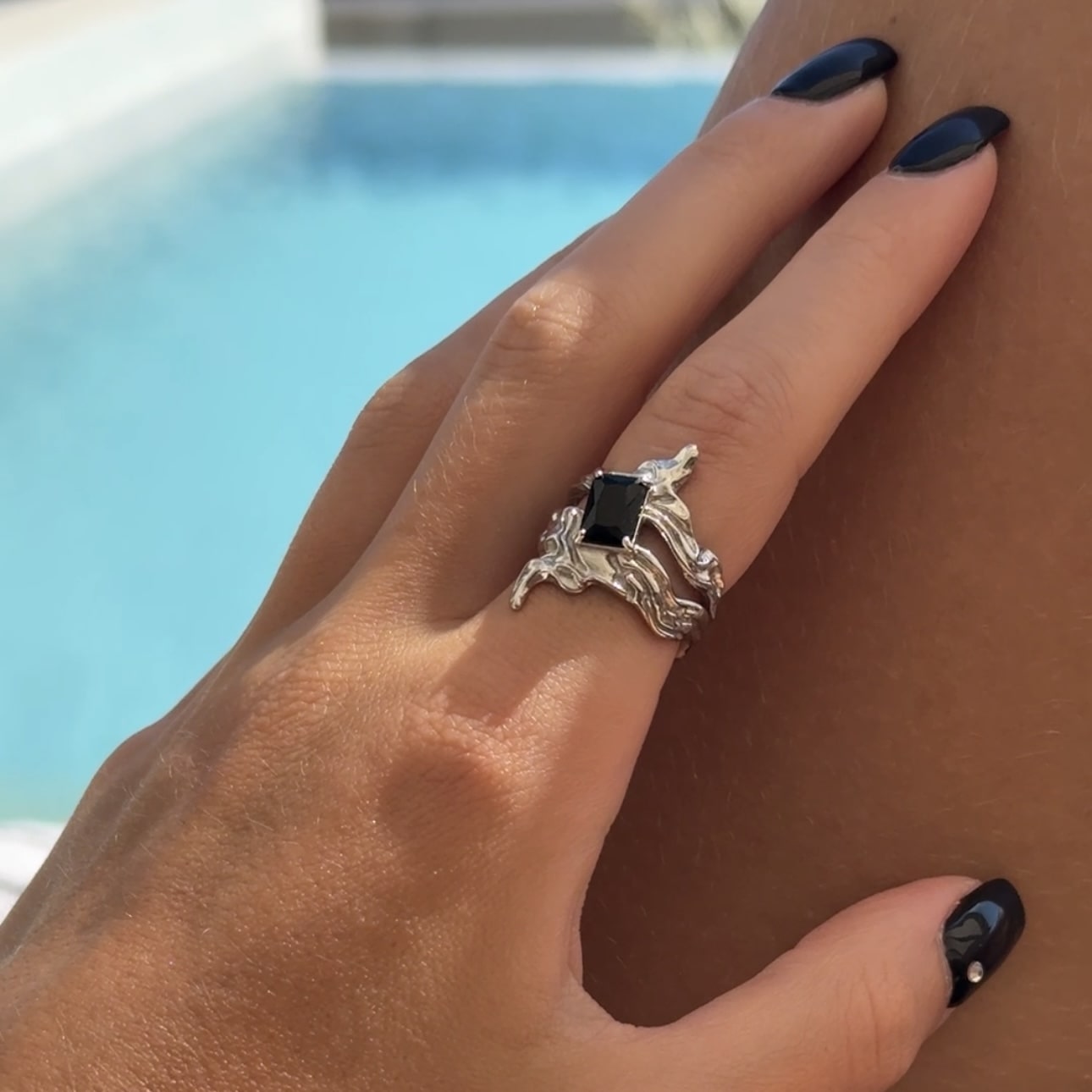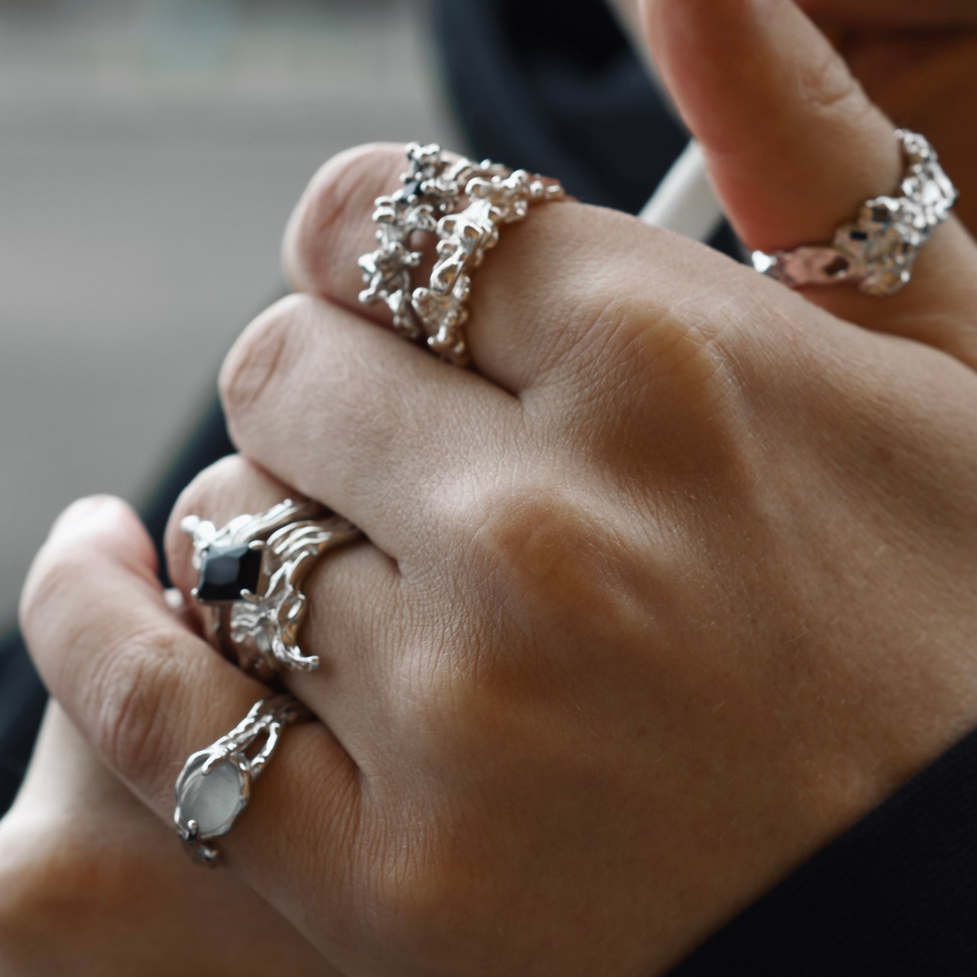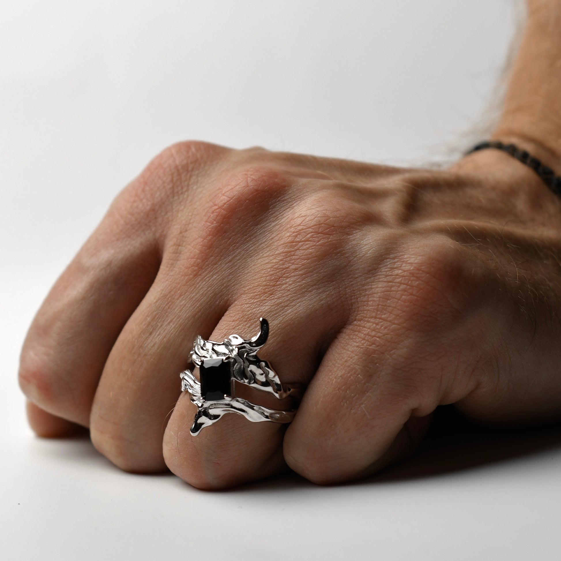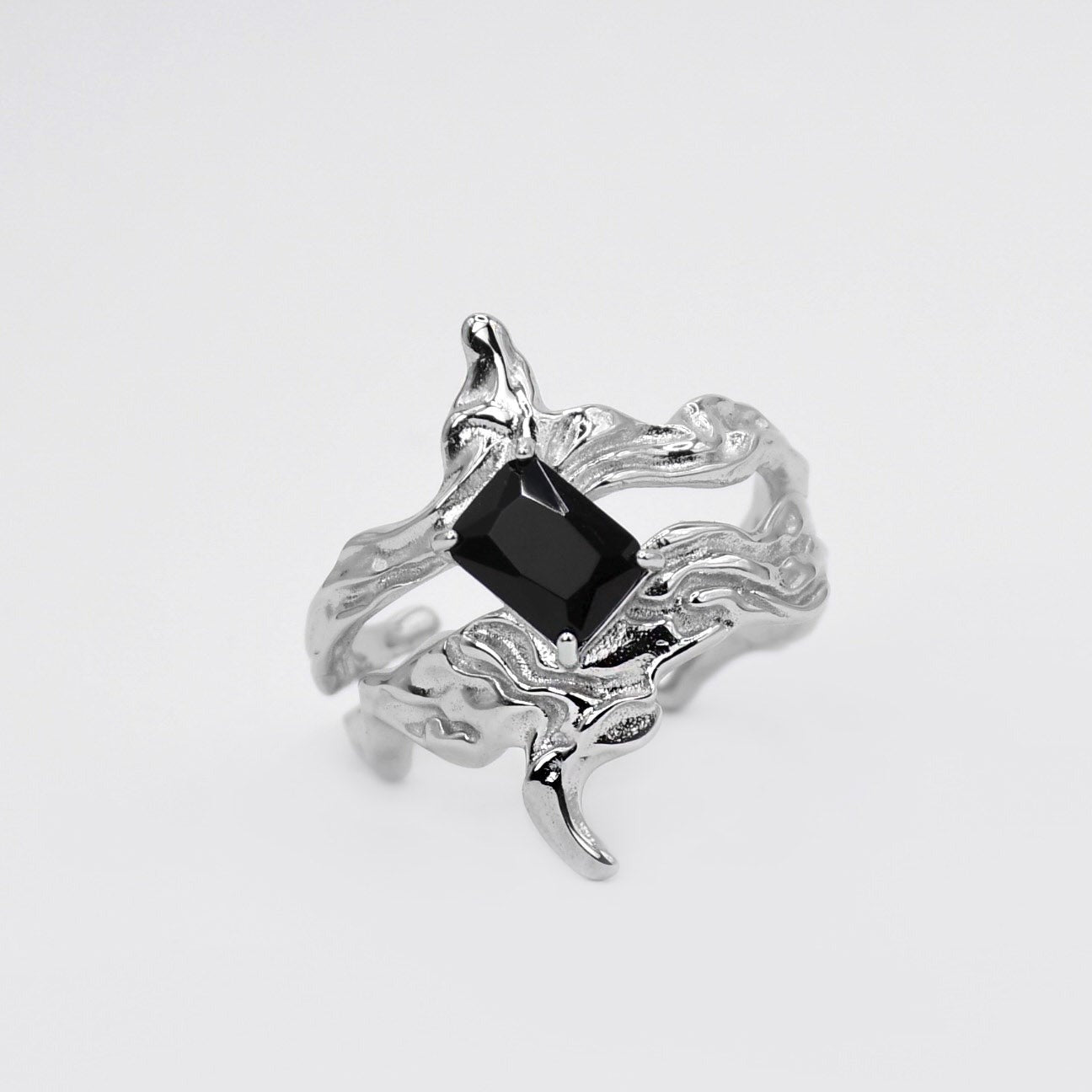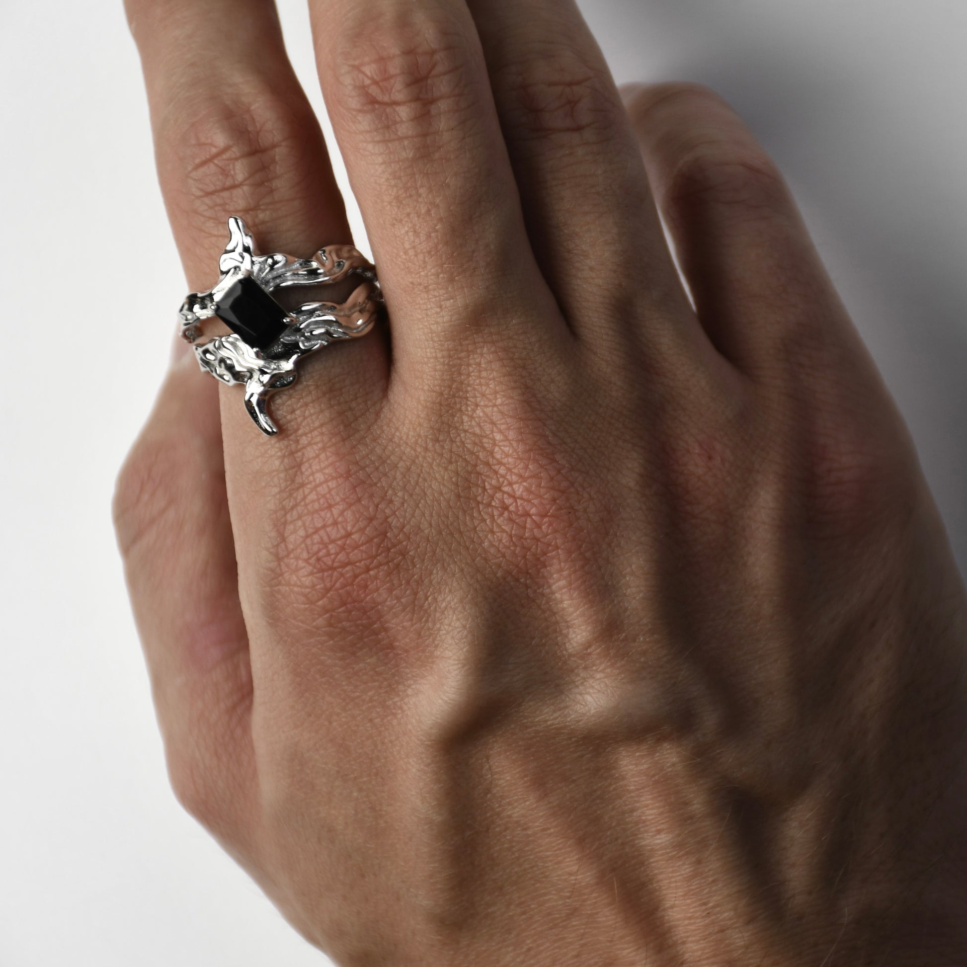 Made of 925 Silver with high-polish rhodium coating. This ring boasts a bold and striking design, with its fusion of silver and a deep black stone at its core. This captivating combination symbolizes the enigmatic allure of the midnight hour, where darkness and shimmering moonlight meet, creating an air of mystery and elegance that beckons exploration into the depths of the night.