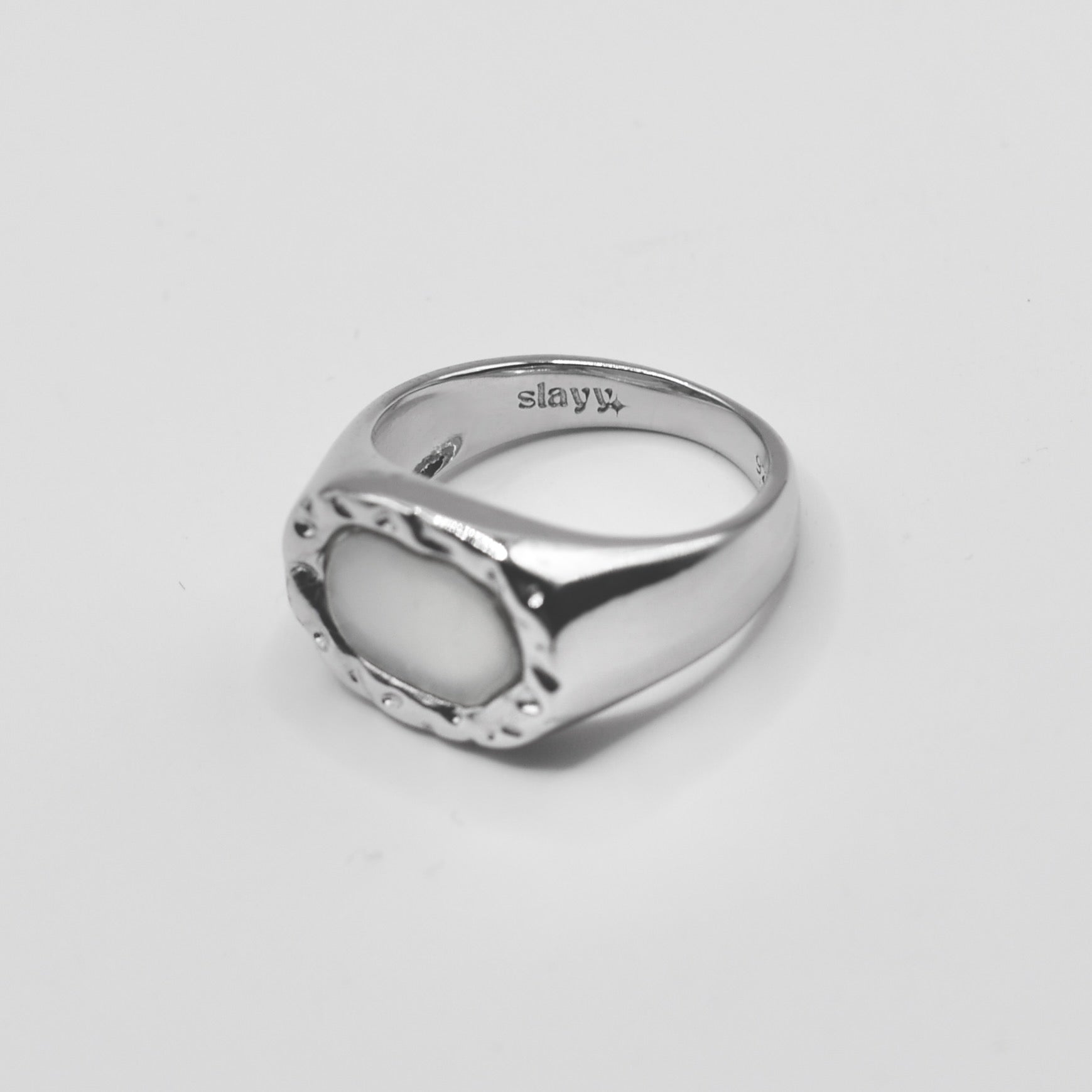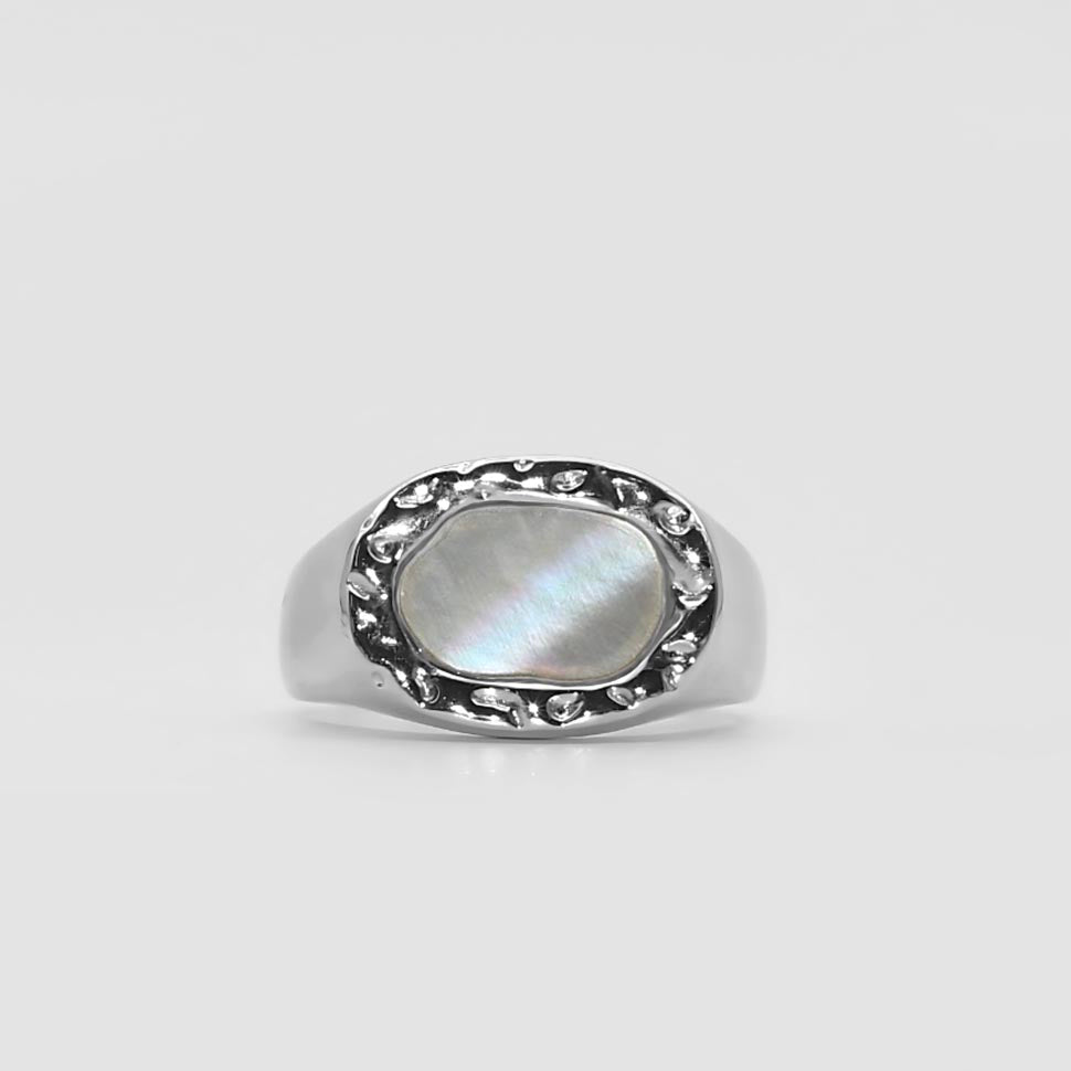 Made of 925 Sterling Silver with high-polish rhodium coating and white pearl shell. Weight of the ring is around 5g.