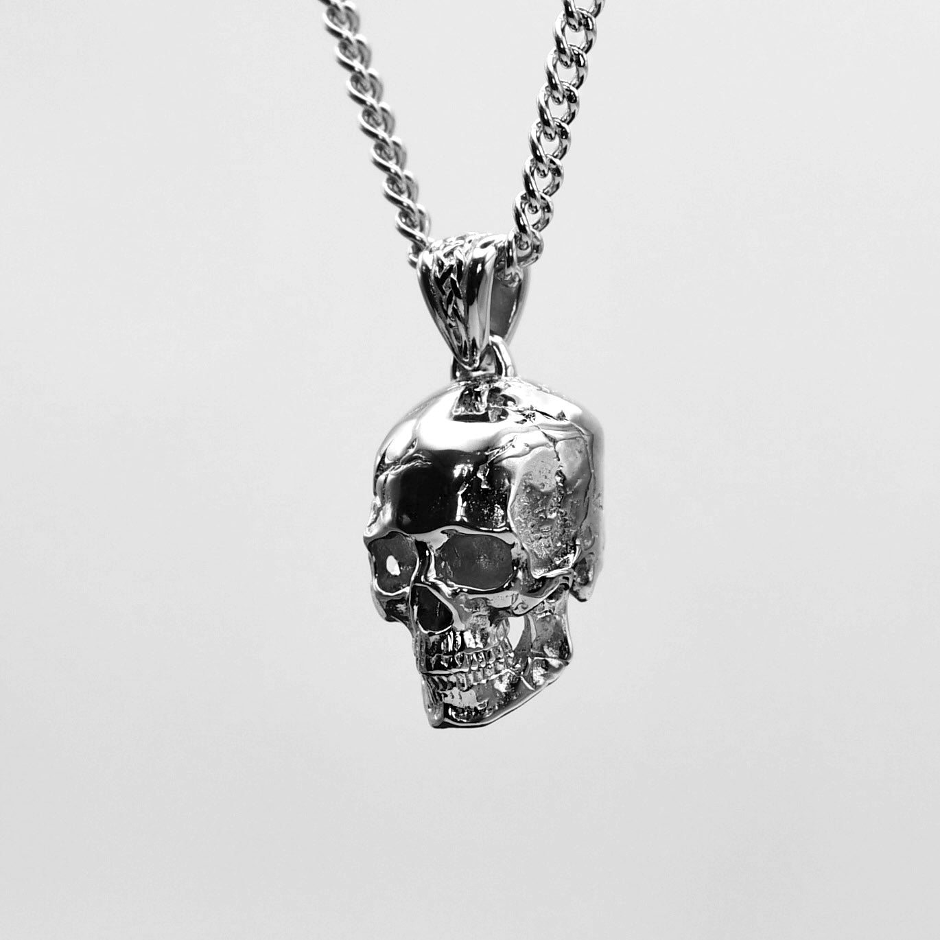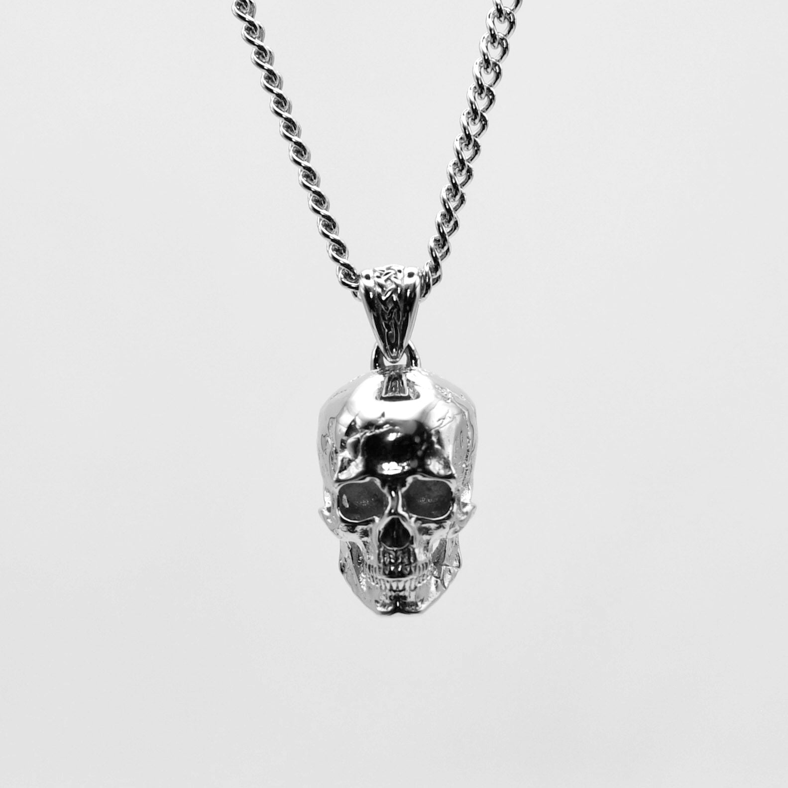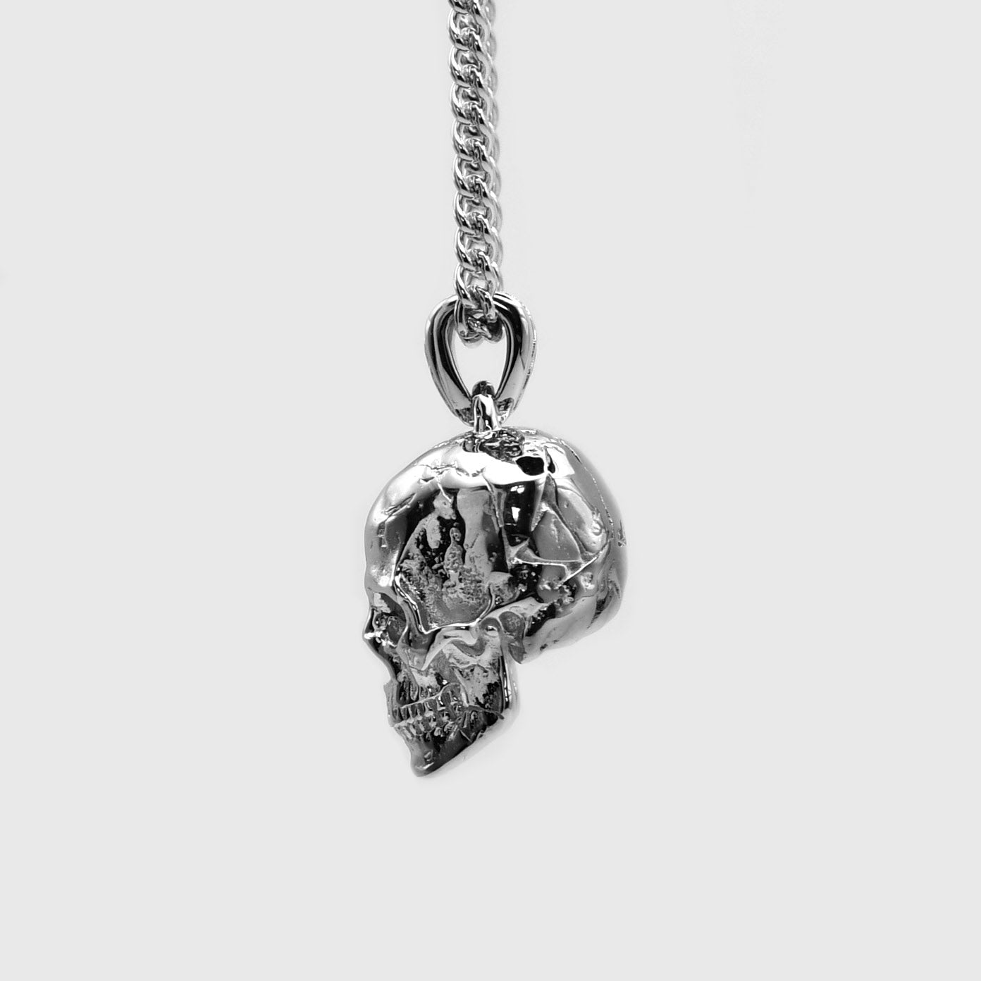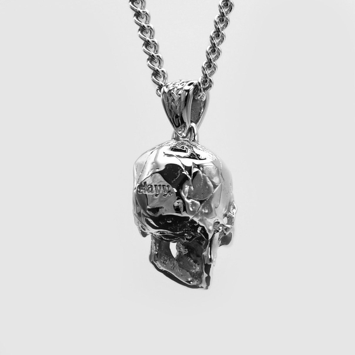 This piece features a finely detailed, sophisticated hand crafted skull that commands attention. A bold piece. Slayy logo on the back. Made with rhodium coated 925 sterling silver.