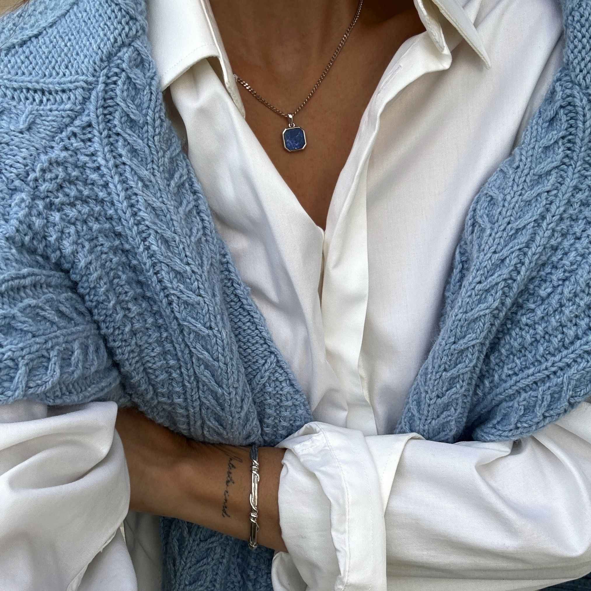 Made of rhodium-coated 925 sterling silver and natural sodalite. Please note that each stone's cut pattern is slightly unique.