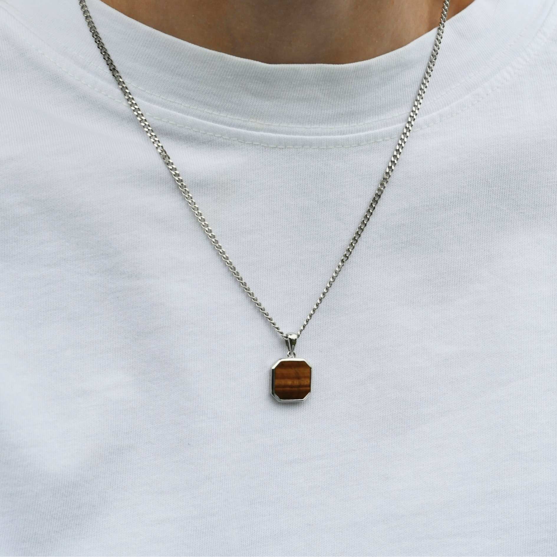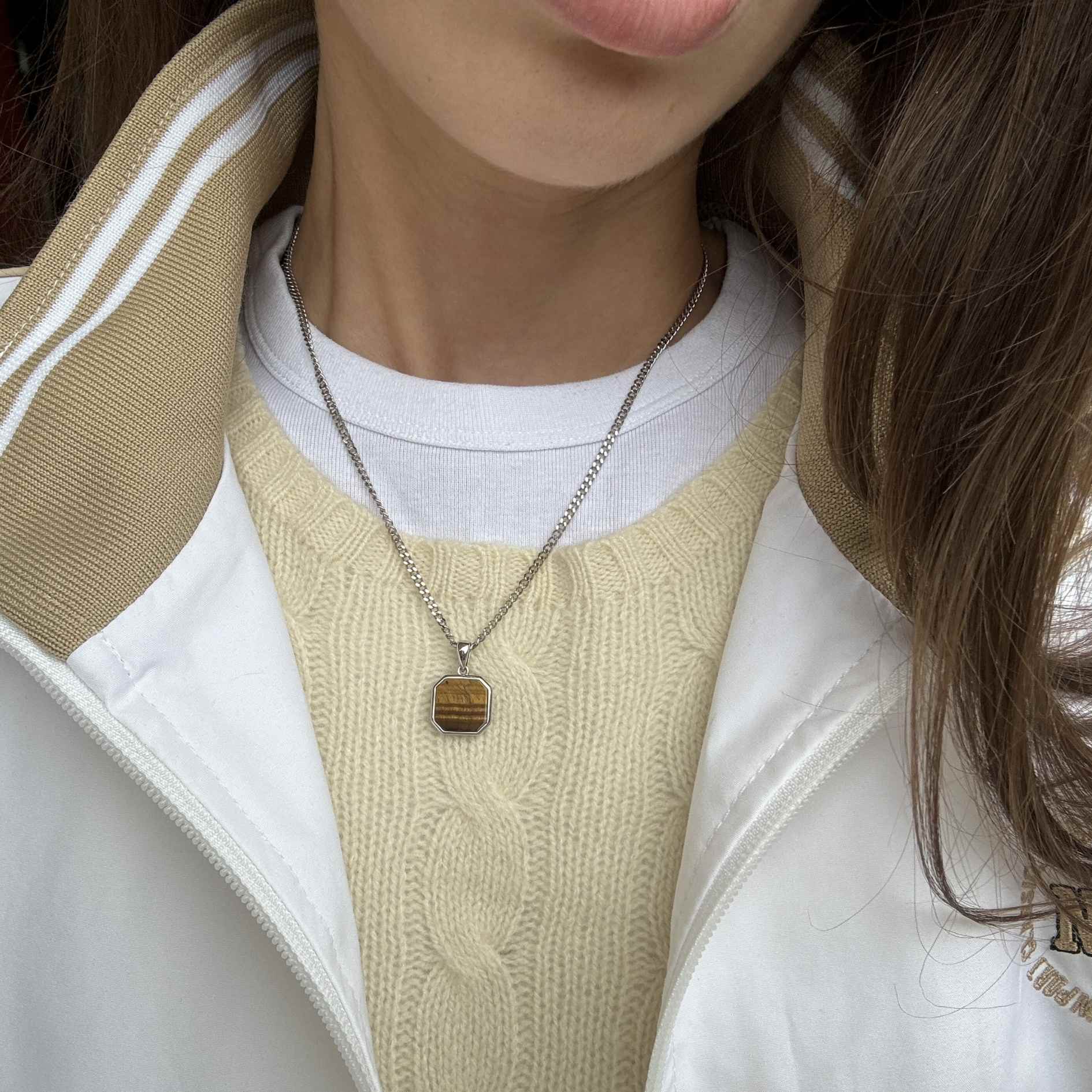 Made of rhodium-coated 925 sterling silver and natural tiger's eye. Please note that each stone's cut pattern is slightly unique.